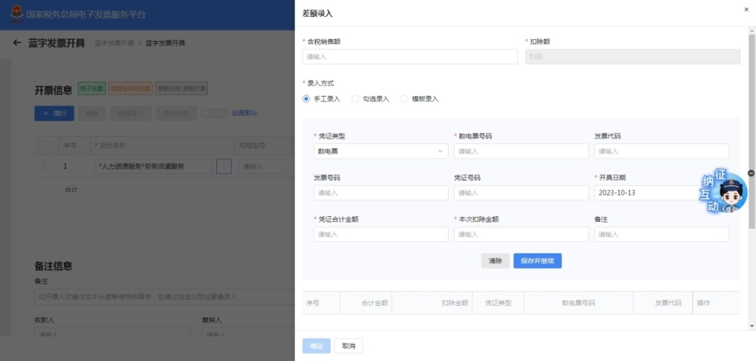 3.填寫購(gòu)買方信息后,錄入或選擇項(xiàng)目開票名稱“人力資源服務(wù)*勞務(wù)派遣服務(wù)”,自動(dòng)彈出扣除項(xiàng)填寫界面。