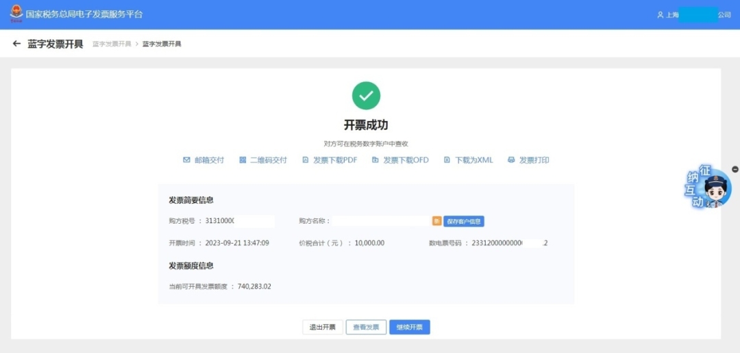 1.核對(duì)開票信息無(wú)誤后,點(diǎn)擊【發(fā)票開具】按鈕,提示開具成功,即完成發(fā)票開具。
