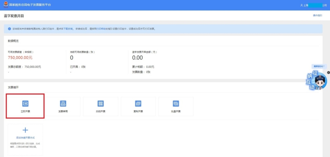 2.點(diǎn)擊【立即開票】,選擇【差額征稅-差額開票】進(jìn)入開票界面。