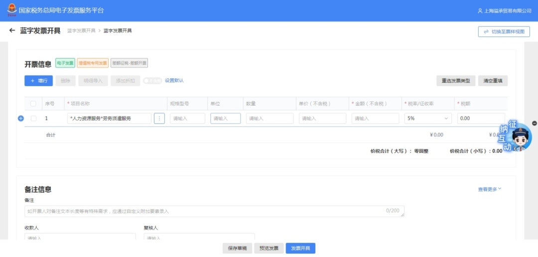 1.按照現(xiàn)行政策規(guī)定適用差額征稅辦法繳納增值稅,且不得全額開具增值稅發(fā)票的,可在電子發(fā)票服務(wù)平臺(tái)開具發(fā)票時(shí)選擇“差額征稅——差額開票”。如,經(jīng)紀(jì)代理服務(wù)、旅游服務(wù)、勞務(wù)派遣服務(wù)(5)安保服務(wù)、人力資源外包服務(wù)、簽證代理服務(wù)、金融商品轉(zhuǎn)讓等。