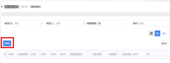您也可以進入【開票業(yè)務】--【藍字發(fā)票開具】界面,點擊“去調(diào)整”,系統(tǒng)將自動跳轉(zhuǎn)至發(fā)票額度調(diào)整申請界面。進入發(fā)票額度調(diào)整申請界面后,點擊【新增申請】