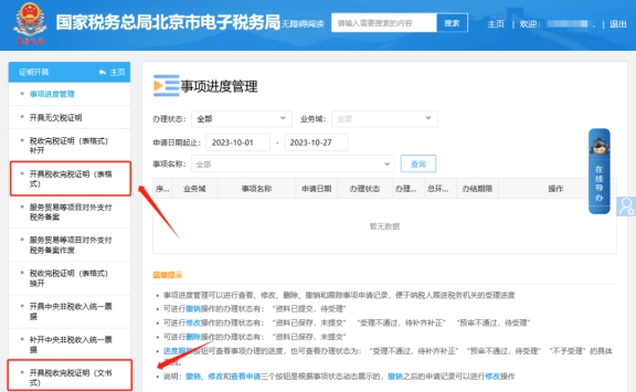 二、證明開具—開具稅收完稅證明(文書式)、開具稅收完稅證明(表格式)。