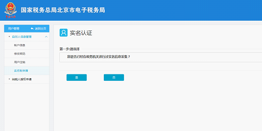 7.? 納稅人點擊“確定”按鈕后,進入實名認(rèn)證界面,出現(xiàn)選擇提示“您是否已經(jīng)在稅務(wù)機關(guān)進行過實名信息采集”,點擊“是”進入關(guān)聯(lián)實名信息界面;點擊“否”進入立思辰人臉識別驗證界面;