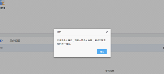 6.? 系統(tǒng)首先彈出“未綁定個人身份,不能辦理個人業(yè)務(wù)”的提示信息。納稅人可點擊“確定”按鈕。