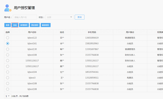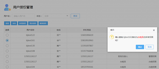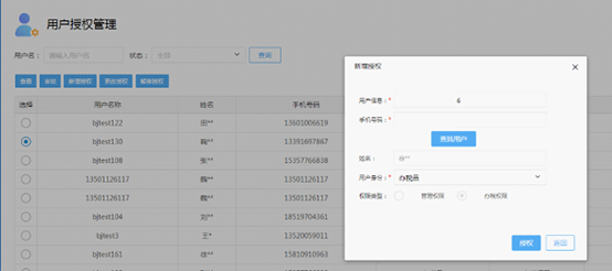 11.????? 企業(yè)授權(quán):納稅人還可進行新增授權(quán)操作,輸入用戶信息和手機號碼,查詢出需要授權(quán)的相關(guān)用戶,選擇用戶身份,點擊授權(quán)即可。