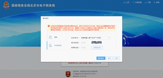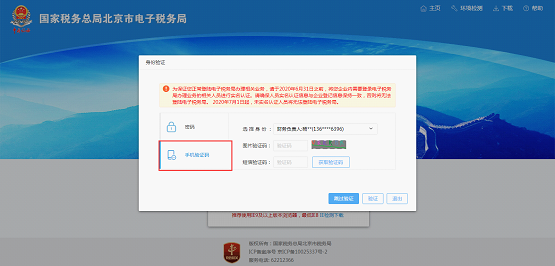 2.? 選擇手機驗證碼登錄,輸入圖片驗證碼,點擊“獲取驗證碼”按鈕,短信平臺會向該人員實名認(rèn)證時登記的手機號發(fā)送驗證碼信息;輸入短信驗證碼,點擊“驗證”按鈕,即可進入電子稅務(wù)局首頁界面;
