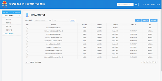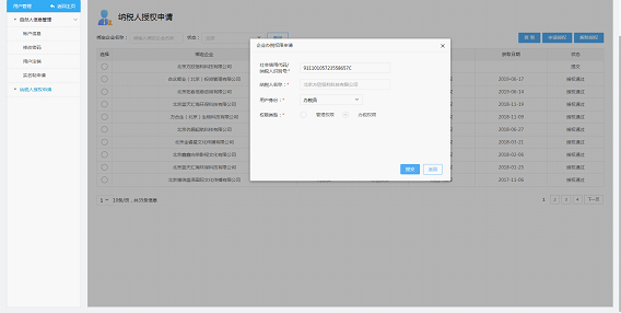 2)? 納稅人點擊“申請授權(quán)”按鈕后,填寫相關(guān)信息,選擇用戶身份,點擊“提交”按鈕。