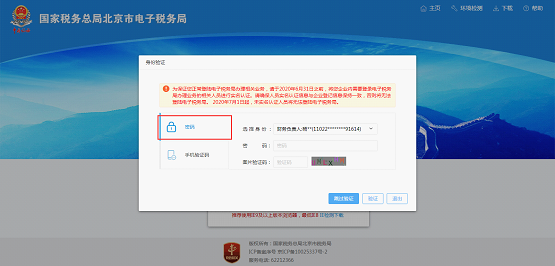 1.? 選擇密碼方式登錄,選擇需要登錄電子稅務(wù)局的人員身份,輸入密碼(密碼為電子稅務(wù)局個人賬號登錄密碼)、圖片驗證碼,點擊“驗證”按鈕,即可進入電子稅務(wù)局首頁界面;