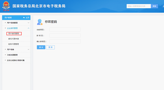 3)? 企業(yè)納稅人審核,企業(yè)登錄電子稅務(wù)局,在我的信息----用戶管理里面,點擊打開企業(yè)授權(quán)管理,選擇用戶授權(quán)管理,點擊打開;