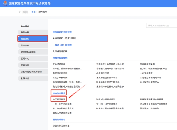答、北京月銷售額10萬以內(nèi)的小規(guī)模納稅人應(yīng)該在【地方特色】—【我要辦稅】—【綜合信息報告】—【跨區(qū)稅源登記】功能中辦理跨區(qū)稅源登記。