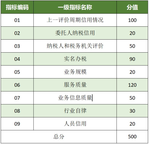 涉稅專業(yè)服務(wù)機構(gòu)信用積分共涉及9個一級指標,滿分為500分。