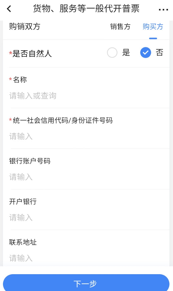 2.3、點(diǎn)擊“添加購(gòu)買方”,選擇是否為自然人,錄入購(gòu)買方信息:名稱、統(tǒng)一社會(huì)信息代碼/身份證件號(hào)碼、銀行賬戶號(hào)碼、開戶銀行、聯(lián)系地址、聯(lián)系電話、選擇是否展示銀行信息,點(diǎn)擊【保存】。名稱項(xiàng)為必填,其他項(xiàng)為選填。