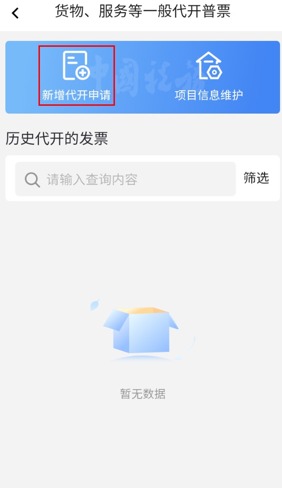 2.2、點(diǎn)擊【貨物、服務(wù)等一般代開】-【新增代開申請(qǐng)】進(jìn)入代開申請(qǐng)頁(yè)面。