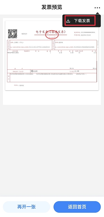 從開具成功界面進(jìn)入發(fā)票下載界面:點(diǎn)擊【確定】,進(jìn)入發(fā)票預(yù)覽頁(yè)面,點(diǎn)擊相應(yīng)的按鈕,選擇“下載發(fā)票”進(jìn)行下載。
