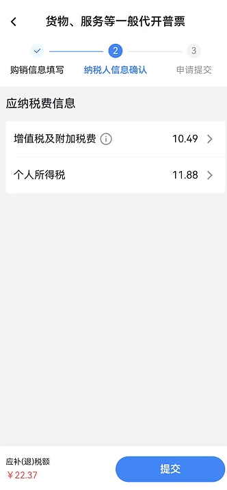 2.7、納稅信息確認(rèn):系統(tǒng)根據(jù)填寫的發(fā)票信息自動(dòng)加載應(yīng)納稅款信息,納稅人確認(rèn)無(wú)誤后點(diǎn)擊【提交】。
