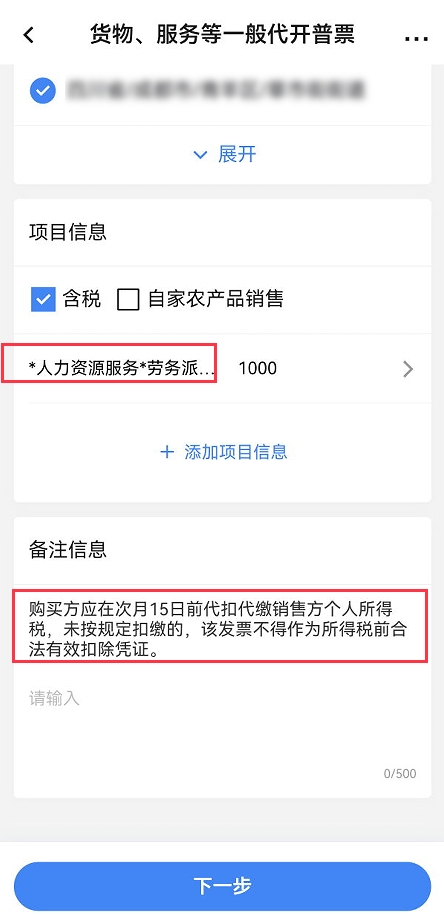 貨物、服務(wù)等一般代開普票時(shí),若個(gè)人所得稅品目為勞務(wù)報(bào)酬、稿酬、特許權(quán)使用費(fèi)所得時(shí),納稅人信息確認(rèn)界面溫馨提示:本次代開申請(qǐng)個(gè)人所得稅項(xiàng)目為勞務(wù)報(bào)酬、稿酬、特許權(quán)使用費(fèi)所得時(shí),由購(gòu)買方次月15日內(nèi)代扣代繳,如存在異議,請(qǐng)前往稅務(wù)大廳辦理。若為其他個(gè)人所得稅品目不顯示溫馨提示。