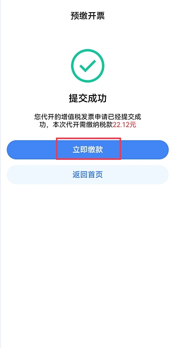 代開申請(qǐng)?zhí)峤怀晒?,無(wú)需審核,需繳款,跳轉(zhuǎn)至預(yù)繳開票頁(yè)面,繳款成功后,可自行開具數(shù)電票;