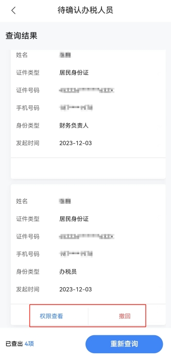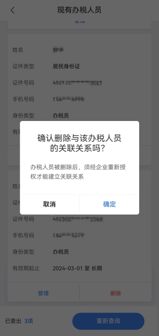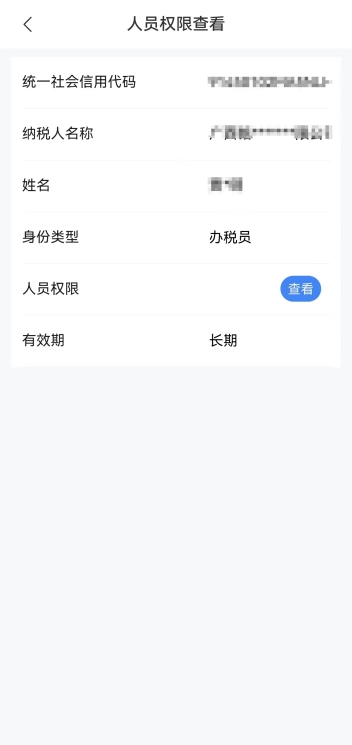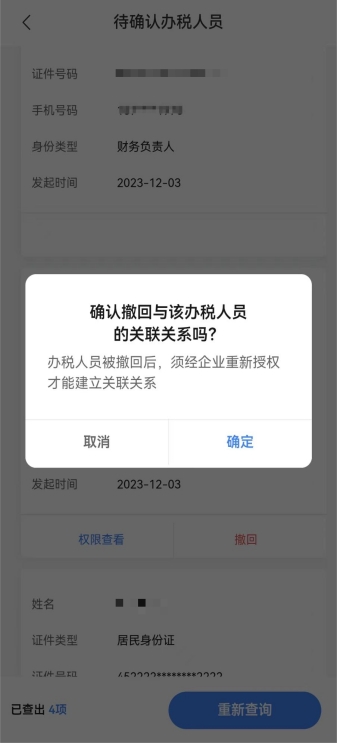 進(jìn)入賬戶中心頁(yè)面。點(diǎn)擊選擇“人員權(quán)限信息管理-待確認(rèn)辦稅人員”。錄入查詢條件(若不錄入默認(rèn)查詢?nèi)?點(diǎn)擊查詢,查詢出待確認(rèn)辦稅人員信息的基本信息,可對(duì)待確認(rèn)辦稅人員授權(quán)信息進(jìn)行查看或撤回授權(quán)(注:身份類型為法定代表人、財(cái)務(wù)負(fù)責(zé)人的人員關(guān)系不允許刪除)。