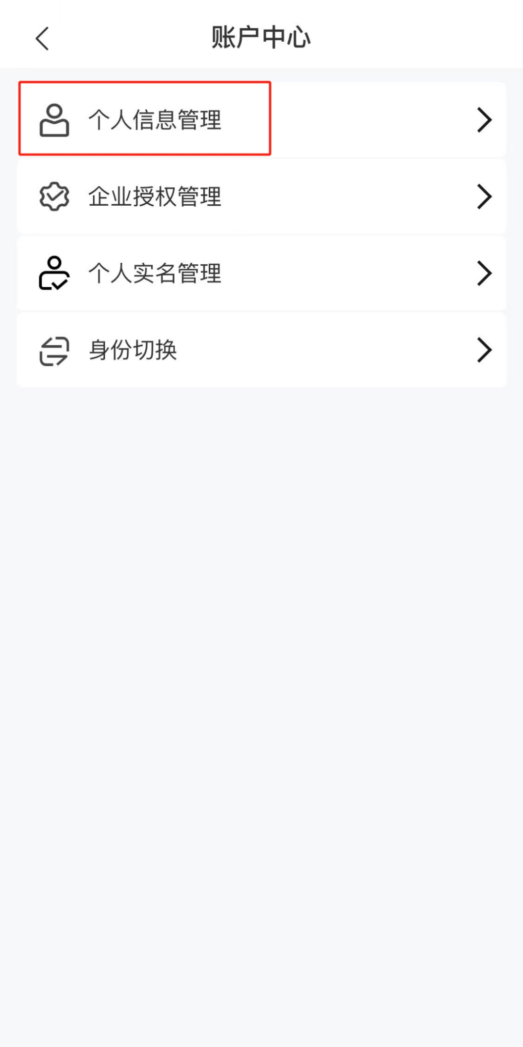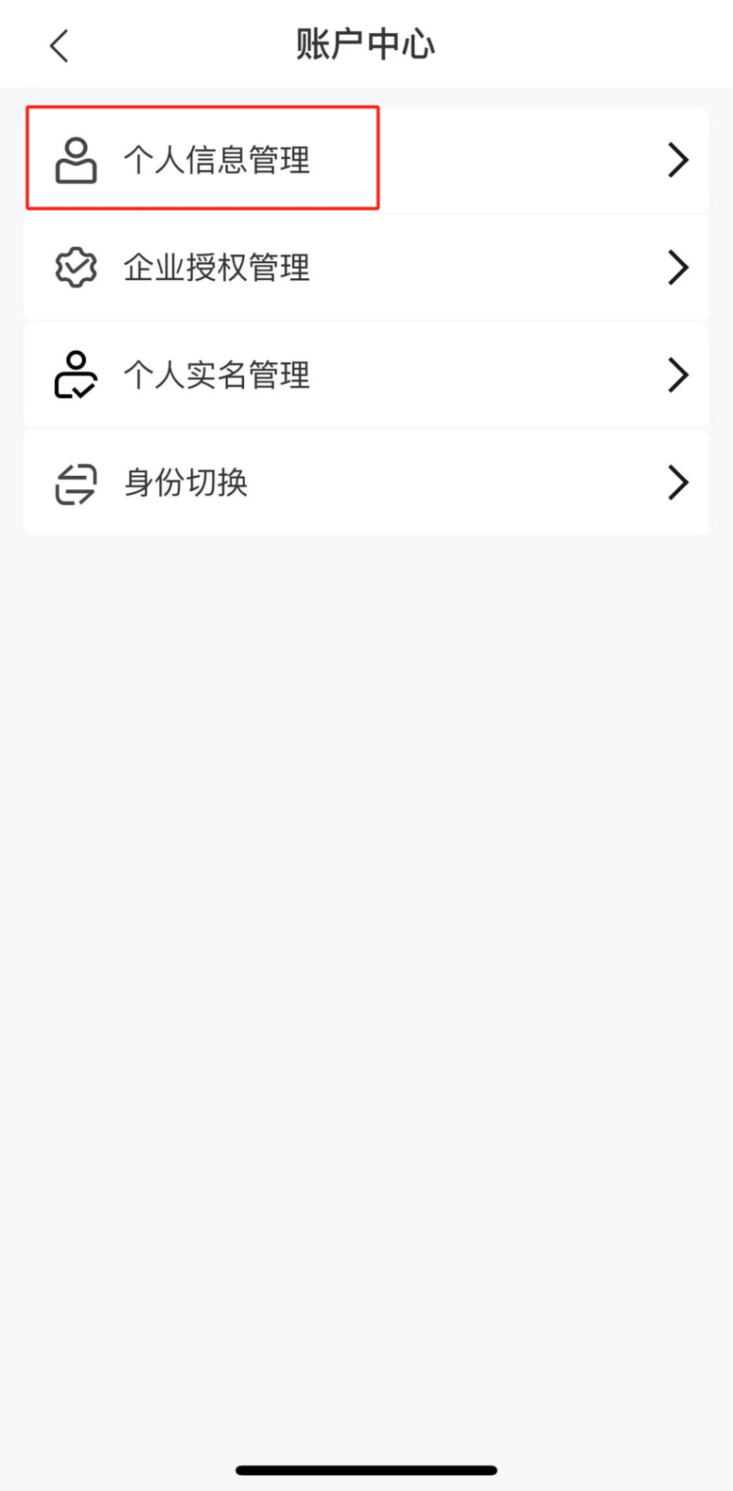 用戶以個(gè)人身份登錄或切換至個(gè)人身份后(切換操作詳見下文身份切換),進(jìn)入賬戶中心頁(yè)面。點(diǎn)擊選擇“人員信息管理”,可選擇查看當(dāng)前登錄的人員基本信息。