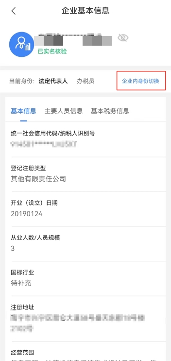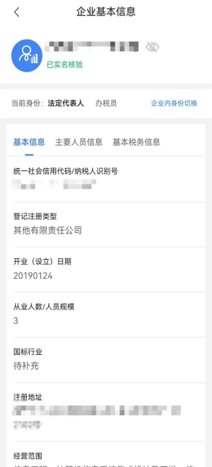 以企業(yè)身份登錄后,點(diǎn)擊【我的】進(jìn)入個(gè)人中心頁(yè)面,點(diǎn)擊“賬戶中心”進(jìn)入賬戶中心頁(yè)面。點(diǎn)擊選擇“企業(yè)信息管理”可查看登錄賬號(hào)的“基本信息”“基本人員信息”和“基本稅務(wù)信息”。