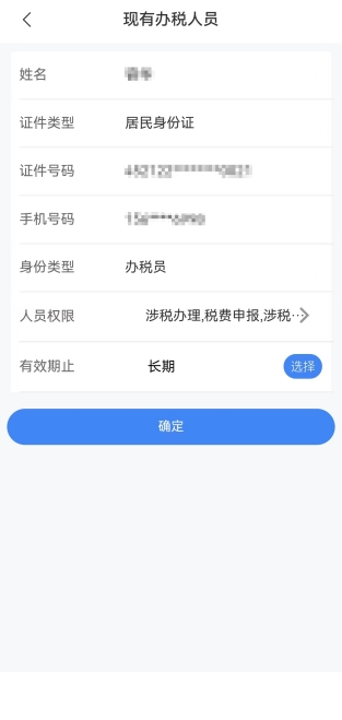 以企業(yè)身份登錄后,進(jìn)入賬戶中心頁(yè)面。點(diǎn)擊選擇“人員權(quán)限信息管理-添加待辦稅人員”。錄入待辦稅人員的基本信息(姓名、證件類型、證件號(hào)碼),選擇人員的授權(quán)信息(身份類型、有效期止、人員權(quán)限),完成待辦稅人員的添加。