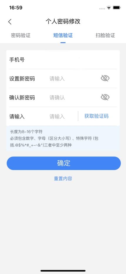 修改密碼有密碼驗(yàn)證、短信驗(yàn)證、掃臉驗(yàn)證三種驗(yàn)證方式,用戶可以任意選擇其中一種依據(jù)提示完成密碼修改。