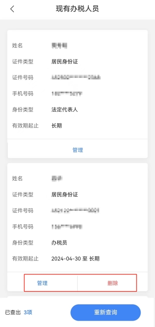 進(jìn)入賬戶中心頁(yè)面,點(diǎn)擊選擇“人員權(quán)限信息管理-現(xiàn)有辦稅人員”。錄入查詢條件(若不錄入默認(rèn)查詢?nèi)?點(diǎn)擊查詢,可查詢出現(xiàn)有辦稅人員信息的基本信息,可對(duì)現(xiàn)有辦稅人員的授權(quán)信息進(jìn)行管理或刪除人員關(guān)系(身份類型為法定代表人、財(cái)務(wù)負(fù)責(zé)人的人員關(guān)系不允許刪除)。