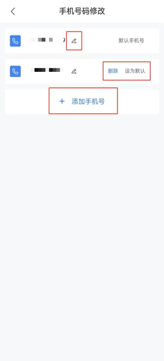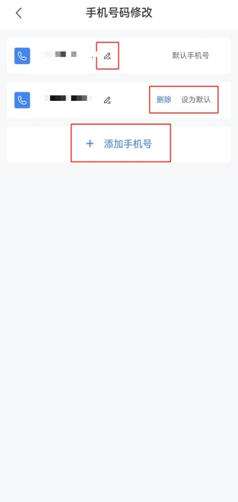用戶進(jìn)入賬戶中心頁(yè)面,點(diǎn)擊選擇“手機(jī)號(hào)”打開手機(jī)號(hào)維護(hù)頁(yè)面,可對(duì)個(gè)人手機(jī)號(hào)碼進(jìn)行新增、修改、刪除及更換默認(rèn)手機(jī)號(hào)操作(注意:新增、刪除、修改手機(jī)號(hào)功能需要進(jìn)行短信或掃臉認(rèn)證)。