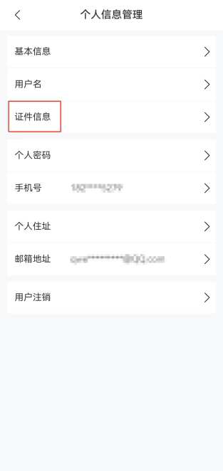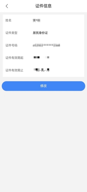 進(jìn)入賬戶中心頁(yè)面,點(diǎn)擊選擇“證件信息”可進(jìn)行證件查看,點(diǎn)擊選擇“修改”可進(jìn)行證件信息修改(注意:證件類型及證件號(hào)碼不允許修改)。