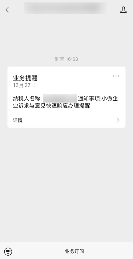 用戶通過關(guān)注微信公眾號:“北京稅務(wù)服務(wù)號”。經(jīng)實名手機號碼關(guān)聯(lián)綁定并且完成業(yè)務(wù)提醒訂閱后,即可通過個人微信接收新電子稅局APP的業(yè)務(wù)提醒與反饋,如服務(wù)提醒等,并可查看明細等。