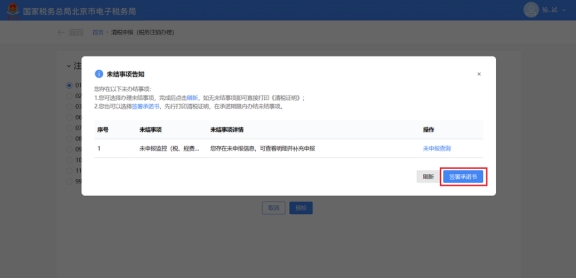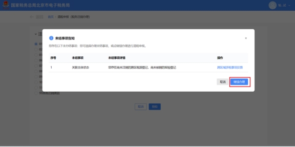 ①系統(tǒng)彈出未結(jié)事項(xiàng)告知界面,系統(tǒng)提示“您存在以下未辦結(jié)事項(xiàng):您可選擇辦理未結(jié)事項(xiàng),辦理完結(jié)后點(diǎn)擊刷新,繼續(xù)進(jìn)行清稅申報(bào)?!?,展示未結(jié)事項(xiàng)以及對(duì)應(yīng)辦理鏈接按鈕,點(diǎn)擊【繼續(xù)辦理】。