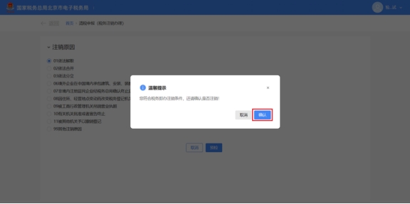 ?、谙到y(tǒng)提示“尊敬的納稅人:您符合稅務(wù)即辦注銷條件,確認(rèn)是否注銷!”,點(diǎn)擊【確認(rèn)】。