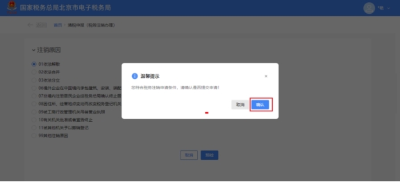 ?、谙到y(tǒng)提示“尊敬的納稅人:您符合稅務(wù)注銷申請(qǐng)條件,確認(rèn)是否提交申請(qǐng)!”,點(diǎn)擊【確認(rèn)】。