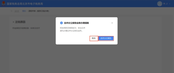 (2)注銷原因?yàn)椤?2依法合并】、【03依法分立】時(shí)。彈出合并分立報(bào)告業(yè)務(wù)辦理提醒:“您選擇的注銷原因?yàn)椋阂婪ê喜?。?qǐng)先辦理合并分立報(bào)告業(yè)務(wù)?!?,點(diǎn)擊【合并分立報(bào)告】系統(tǒng)跳轉(zhuǎn)至合并分立報(bào)告功能界面進(jìn)行業(yè)務(wù)辦理(具體操作請(qǐng)查看《合并分立報(bào)告》操作手冊(cè))。點(diǎn)擊【取消】返回功能界面。