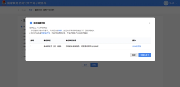 1)符合即辦注銷資格及條件,但存在未辦結(jié)事項(xiàng),且未辦結(jié)事項(xiàng)存在非提示類事項(xiàng)時(shí)。彈出未結(jié)事項(xiàng)告知界面,系統(tǒng)提示“您存在以下未辦結(jié)事項(xiàng):您可選擇辦理未結(jié)事項(xiàng),辦理完結(jié)后點(diǎn)擊刷新,繼續(xù)進(jìn)行清稅申報(bào)?!?,展示未結(jié)事項(xiàng)以及對(duì)應(yīng)辦理鏈接按鈕。
