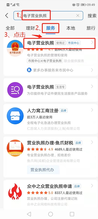 首先確保在使用的微信或和支付寶已經(jīng)實(shí)名認(rèn)證完成,在微信或者支付寶搜索欄里面輸入“電子營(yíng)業(yè)執(zhí)照”六個(gè)字,微信會(huì)在“小程序”里面顯示(支付寶會(huì)在“服務(wù)”顯示),點(diǎn)擊一下對(duì)應(yīng)的小程序(或者服務(wù)),進(jìn)入程序界面。