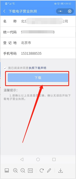 進(jìn)入“電子營(yíng)業(yè)執(zhí)照”程序之后,點(diǎn)一下“下載執(zhí)照”模塊,填寫一下名字,身份證號(hào)碼和手機(jī)號(hào)碼,點(diǎn)擊確定,進(jìn)入下一個(gè)界面,點(diǎn)擊授權(quán),在最后一個(gè)界面掃臉實(shí)名認(rèn)證,認(rèn)證完成,在點(diǎn)擊一下登記地后面的小箭頭,選擇公司對(duì)應(yīng)的注冊(cè)地址登記地“北京”,在已查詢出可下載的記錄模塊,選擇要下載公司的電子營(yíng)業(yè)執(zhí)照,在對(duì)應(yīng)的公司名稱上面點(diǎn)擊一下,核對(duì)信息無(wú)誤后,點(diǎn)擊下載,下載成功后電子營(yíng)業(yè)執(zhí)照就可以正常使用了,以后也可以不進(jìn)入小程序,直接用微信或者支付寶掃一下二維碼就可以。(重要事情說三遍,電子營(yíng)業(yè)執(zhí)照初始密碼123456,電子營(yíng)業(yè)執(zhí)照初始密碼123456,電子營(yíng)業(yè)執(zhí)照初始密碼123456)