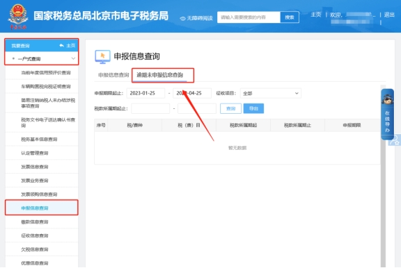 二、我要查詢—一戶式查詢—申報信息查詢—逾期未申報信息查詢,調整查詢條件查看。