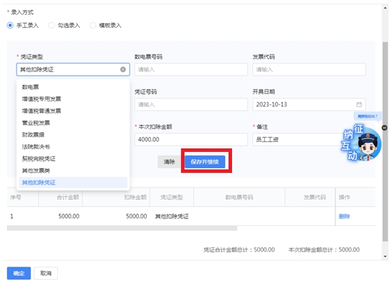 根據(jù)實際情況選擇差額扣除憑證類型,并錄入相關憑證信息(如勞務派遣服務中代用工單位支付給勞務派遣員工的工資、福利和為其辦理社會保險及住房公積金),包括憑證合計金額和本次扣除金額,點擊【保存并繼續(xù)】。