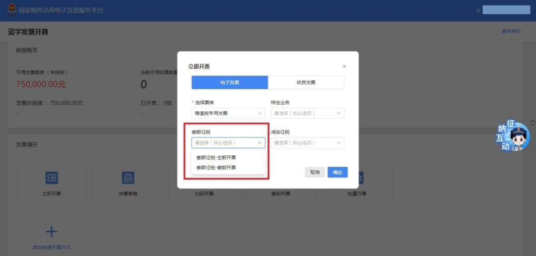 2.點擊【立即開票】,選擇【差額征稅-差額開票】進入開票界面。