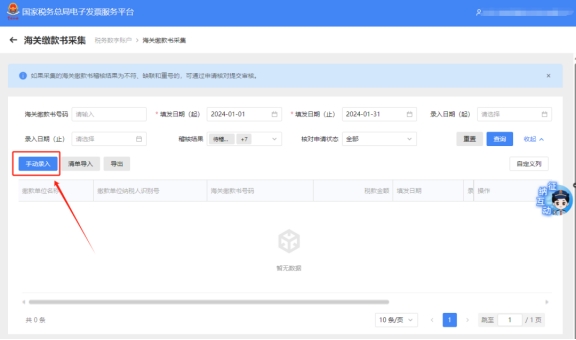 三、海關(guān)繳款書采集,點擊手動錄入。