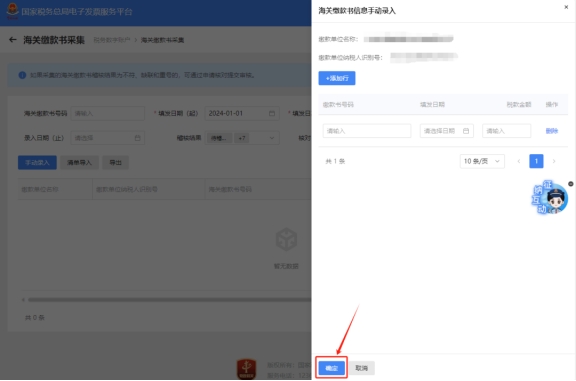 四、點擊【手動錄入】錄入海關(guān)繳款書信息,點擊“確定”成功后,稍后可在查詢界面根據(jù)需要輸入或選擇相關(guān)查詢條件,然后點擊“查詢”按鈕,在結(jié)果展示區(qū)顯示符合查詢條件的海關(guān)繳款書。
