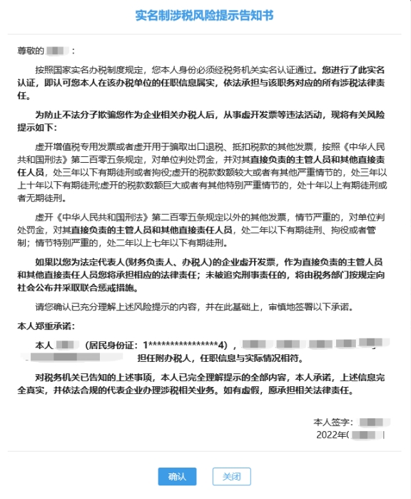 七、實(shí)名制涉稅風(fēng)險提示告知書頁面。