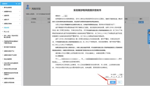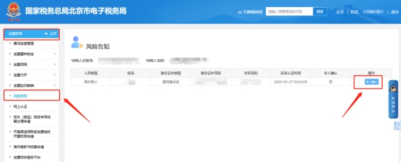 二、發(fā)票使用—風險告知,進入雙向?qū)嵜J證模塊(此處只顯示當前登錄人員的信息,所以需要給誰做雙向?qū)嵜J證,則需要使用該人員的信息驗證登錄),點擊【本人確認】。